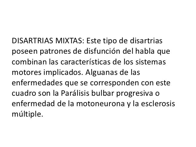 Es posible diferenciar varios tipos de disartria teniendo en cuenta la localización dentro del sistema nervioso central de la lesión o afectación que la ha provocado: La disartria infantil es definida como una alteración neurológica que afecta principalmente la articulación del habla. Más información sobre esta afectación neurológica en nu. La disartria es un trastorno del habla que afecta a un 25% a 55% de los pacientes con esclerosis múltiple (em). Uno de los papeles más importantes que desempeña el patólogo de habla y el lenguaje es determinar si los problemas del habla de la persona se deben a la disartria, a la apraxia, o a ambas.